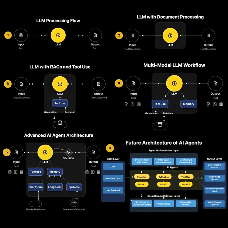In het model dat hieronder is weergegeven, zie je deze ontwikkeling concreet: AI-agents functioneren als een intelligent orkest, met meerdere lagen voor planning, reflectie en toolgebruik. Ze putten uit gestructureerde én ongestructureerde data, gebruiken geheugen (zowel kort als lang) en communiceren met andere agents.