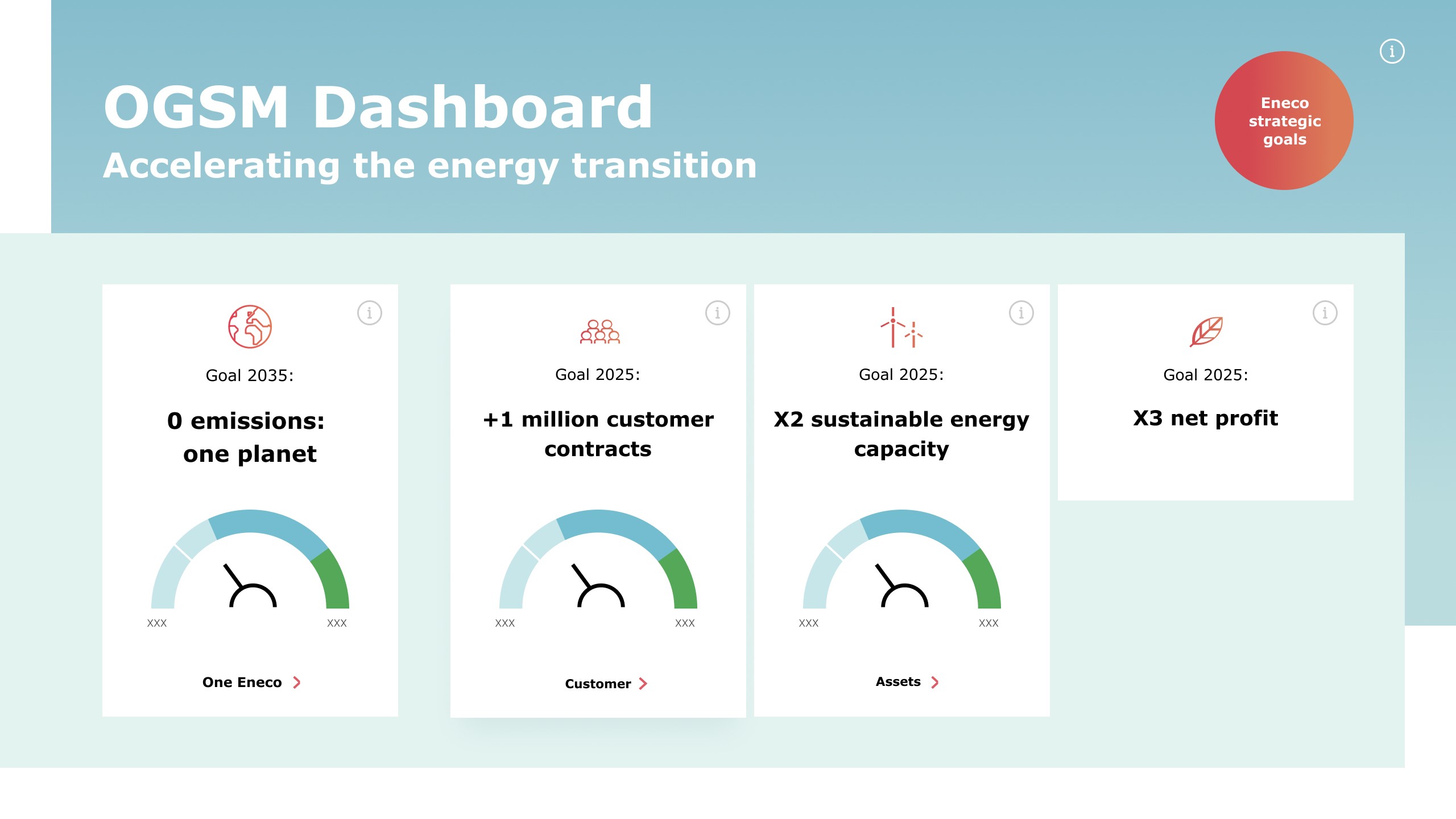 De uitvoering van het klimaatplan is een gezamenlijke inspanning met klanten en medewerkers. Om de strategie en het plan meer zichtbaar te maken voor alle medewerkers, ze te betrekken en deelgenoot te maken, besloot het energiebedrijf een data analytics dashboard te laten ontwerpen en ontwikkelen. Via het dashboard kan iedere medewerker op elk moment van de dag de actuele status zien, en of men op koers ligt om het grote doel te bereiken.