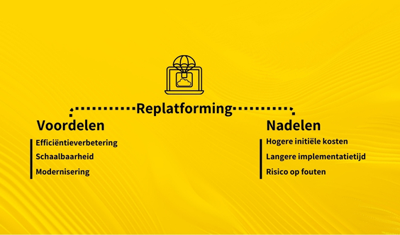 Replatforming wordt ook steeds vaker gecombineerd met de no-code/ low-code omgevingen zoals het Power Platform van Microsoft. Hierbij worden grote delen van het IT-landschap gestandaardiseerd en afgenomen van een clouddienstverlener. Met no-code / low-code worden dan maatwerktoepassingen ontwikkeld die heel flexibel in de organisatie kunnen worden ingezet en ook weer worden aangepast als bedrijfsomstandigheden wijzigen.