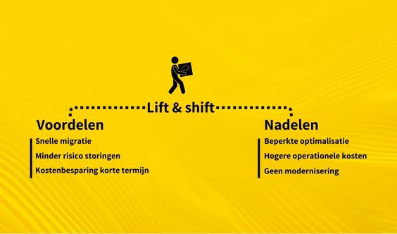 Met het Lift & Shift cloud migration scenario kies je voor een aanpak met een laag risico. Je kunt bijvoorbeeld heel simpel teruggaan naar de bestaande omgeving en het is snel te implementeren. Veel organisaties kiezen voor deze strategie als tussenstap om vanuit de nieuwe omgeving te bouwen aan het nieuwe IT-landschap en zo daadwerkelijk van de meerwaarde van de cloud te kunnen profiteren.